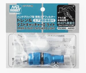 In feuchten Jahreszeiten können sich im Luftschlauch Wassertröpfchen bilden, selbst wenn ein Regler angeschlossen ist. Durch den Anschluss von Mr. Drain & Dust Catcher an die Airbrush werden Wassertröpfchen im Luftschlauch und Staub aus der vom Kompressor abgesaugten Luft unmittelbar vor der Airbrush entfernt. Der „Light“-Typ verwendet Aluminium für den Hauptkörper, was ihn leicht macht. Außerdem liegt die Airbrush besser in der Hand, was die Genauigkeit der Malarbeiten erheblich verbessert.