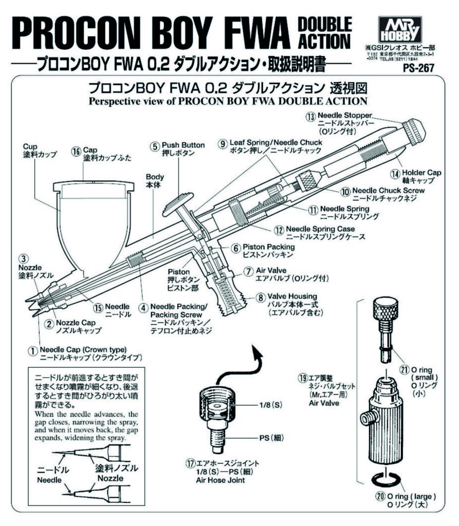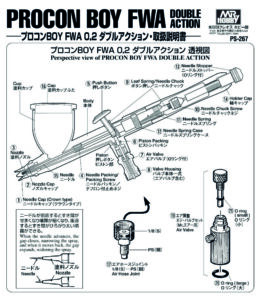 Spare part for MR. HOBBY Airbrush PS267. Needle seal and sealing screw made of brass and plastic to prevent air and paint from escaping. The component is compatible with PS266, PS264, PS289, PS268, PS274, PS276, PS296, PS270.