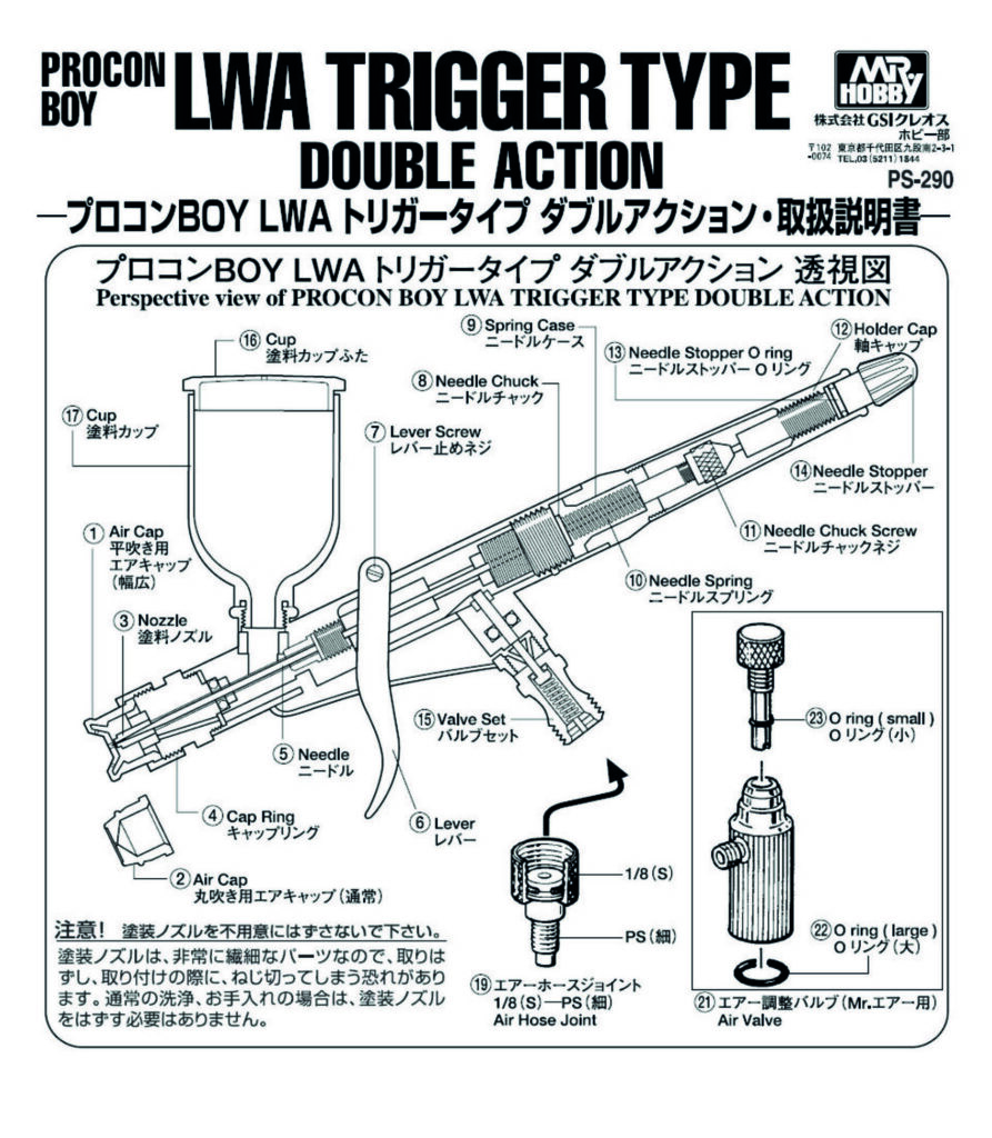Spare parts set for MR. HOBBY Airbrush PS290. Contains needle stop and sealing ring. A needle stop and sealing ring made of brass and rubber for controlled spraying. The component is not compatible with other Airbrushes.