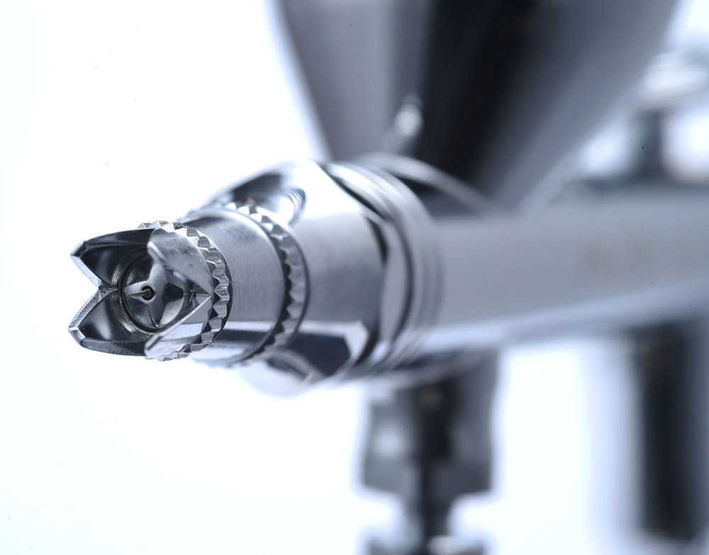 This is the ultimate precision painting airbrush with a 0.2mm nozzle diameter, semi-easy soft button, air adjustment system, and air up mechanism to stabilize air pressure. Comes with 10cc cup.